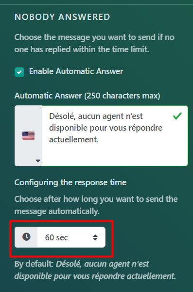 Finally, for the « Nobody answered » scenario, you can configure a response time, which is how long it takes before sending the message. You can adjust this time under the « Nobody answered » secion, by clicking on the drop-down menu for the time: