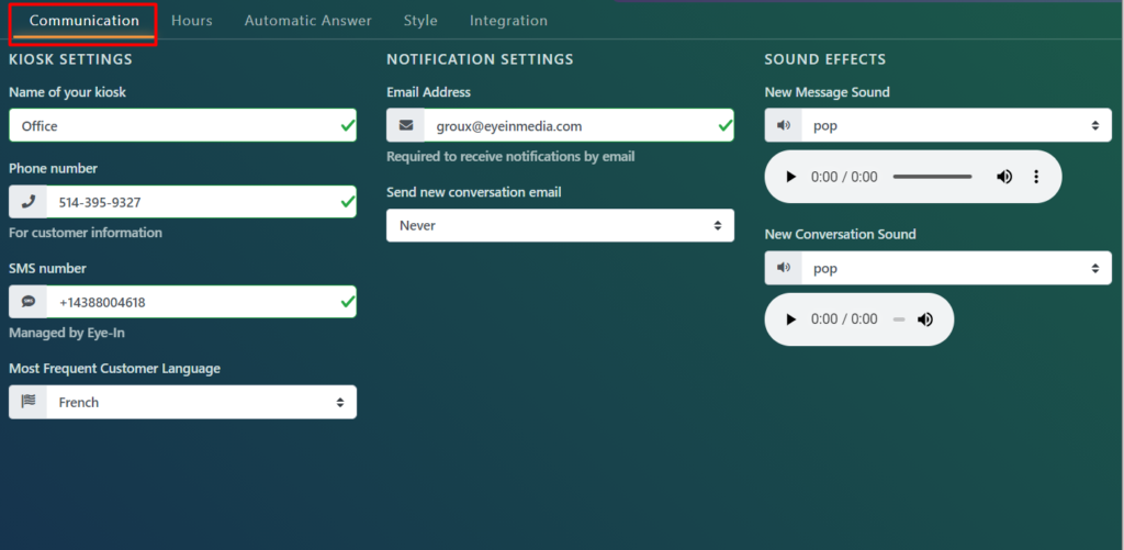 If you have the Communication tab selected, you can modify settings for the kiosk, notification, and sound effects.