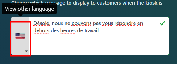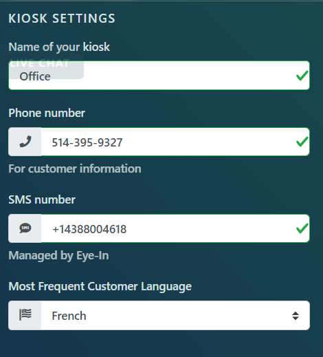 For kiosk settings, you can change the name of your kiosk, phone number, SMS number, and most frequent customer language: