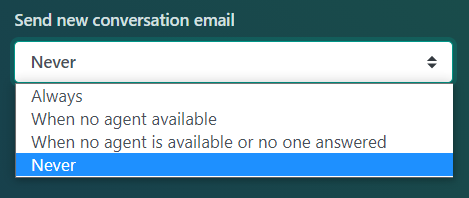 Using the drop-down menu for « Send new conversation email », you can choose the following options: