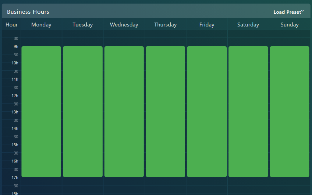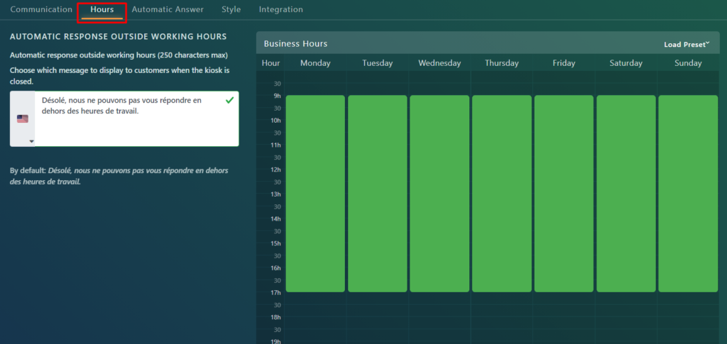 Select the Hours tab in Chat settings. You can modify the automatic response outside your working hours and set your business hours: