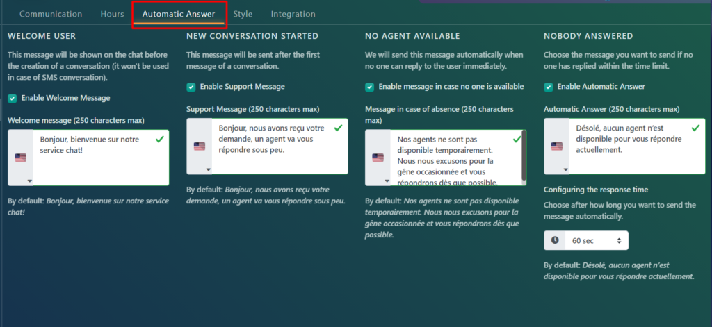For example, the automatic response for the Welcome Message is enabled in this case: