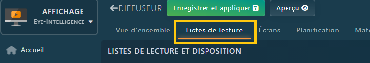 Lorsque vous ouvrez un diffuseur, sélectionnez l’onglet Listes de lecture pour personnaliser le contenu qui doit être lu à l’écran.