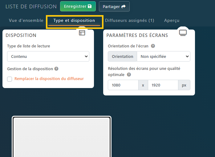 La Résolution et le Ratio de chaque liste de lecture sont définis dans la configuration de la Liste de lecture , dans l’onglet Type & Disposition .
