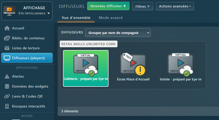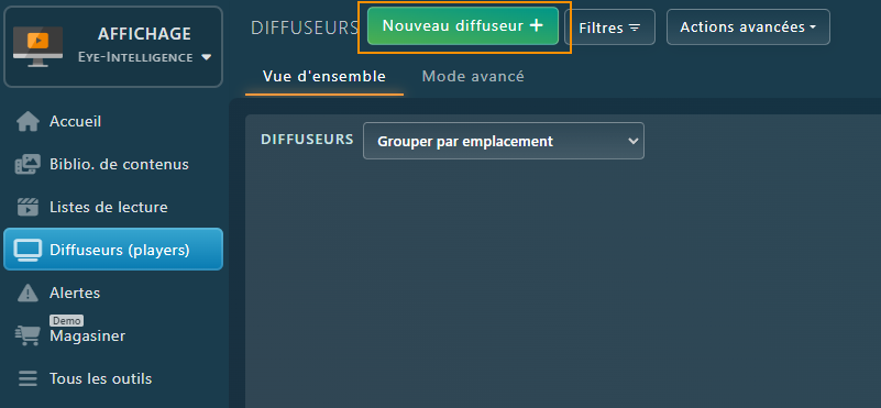 Dans Eye-Intelligence, ouvrez l’onglet Diffuseurs. Si vous disposez d’une liste de diffuseurs virtuels préparés par Eye-In, descendez plus bas à la section Associer un diffuseur préparé par Eye-In
