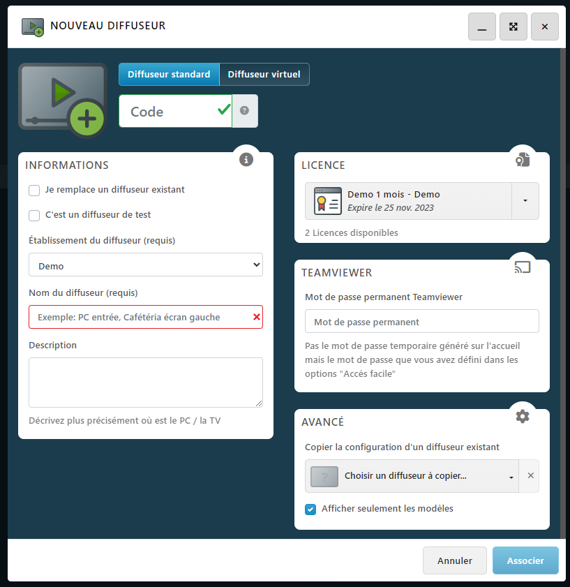 - License : Sélectionnez la license que vous souhaitez attribuer à ce diffuseur. Si vous disposez de différents types de licenses, assurez-vous de choisir la bonne (exemple : si vous disposez d’une licence pour 6 écrans, ne l’associez pas à un diffuseur qui n’a qu’un seul écran).