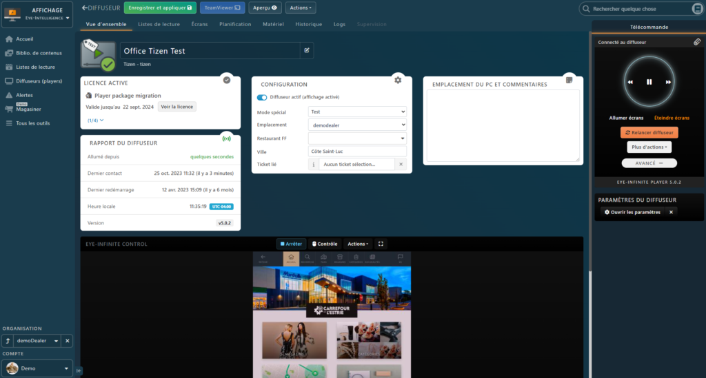 L’outil Eye-Infinite Control situé en bas de la page affiche un aperçu en temps réel de vos écrans (si vous disposez de cette option dans votre forfait). Notez que cet aperçu n’est pas disponible lorsque le diffuseur est virtuel ou qu’il est hors connexion.