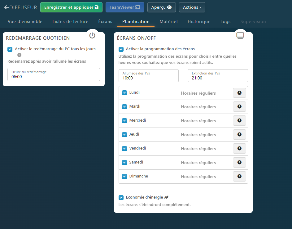 - Le mode Économie d’énergie active la véritable extinction des écrans, pas juste l’affichage d’un écran noir. Si jamais vous constatez que certains diffuseurs ont de la difficulté à s’allumer automatiquement le matin, désactivez cette option.