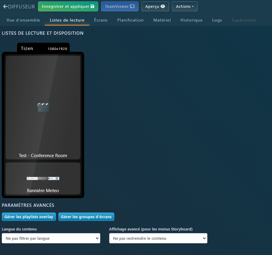 Vous pouvez également cliquer sur le bouton Aperçu tout en haut pour afficher un aperçu de ce qui doit s’afficher sur vos écrans dans votre navigateur. Notez que contrairement à Eye-Infinite Control, cet aperçu n’est pas lié au diffuseur et est disponible également pour un diffuseur virtuel.