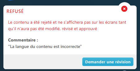 Vous pouvez recevoir cette notification après un examen par l’administrateur si votre contenu présente des problèmes et ne peut être affiché sur les écrans.