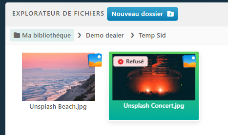 Dans la Bibliothèque de contenus , les fichiers rejetés par les administrateurs sont clairement identifiés par l‘indication rouge « Refusé » .