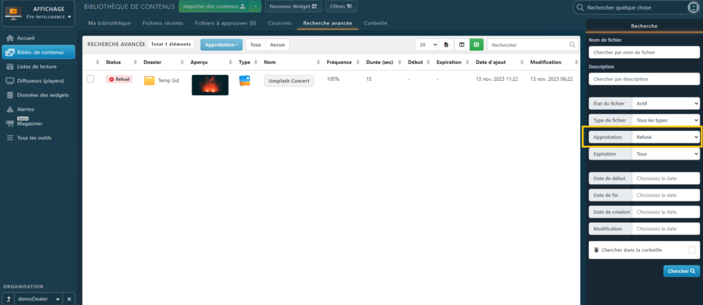 Pour répertorier tous les fichiers qui ont été rejetés par les administrateurs, accédez à la Recherche avancée , puis sélectionnez Refusé dans le filtre Approbation . Cliquez sur le bouton bleu Chercher en bas des filtres.