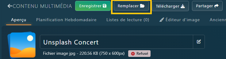 Cliquez sur le bouton Remplacer et sélectionnez la nouvelle version du contenu que vous avez préparé.