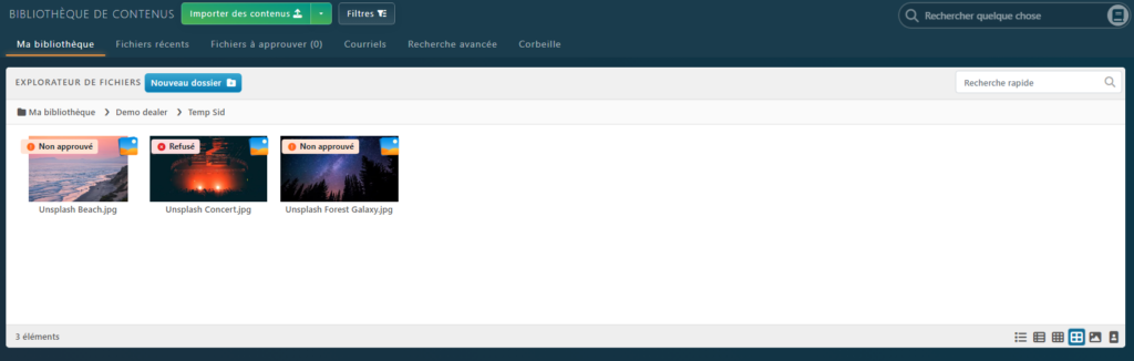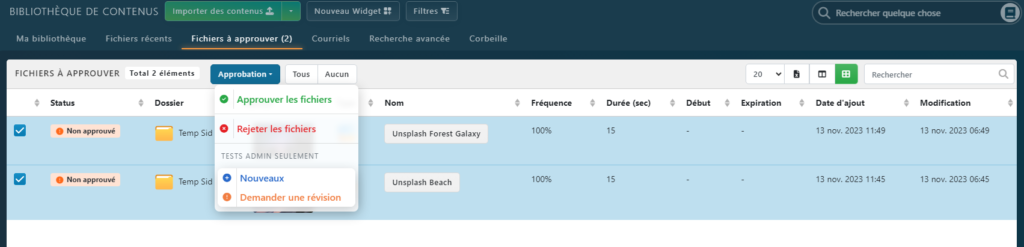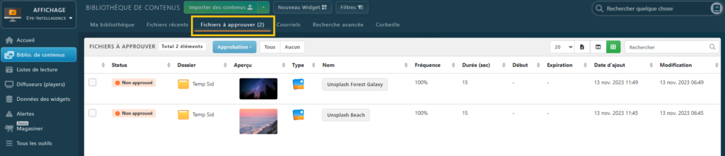 Dans la Bibliothèque de contenus, cliquez sur l’onglet Fichiers à approuver pour répertorier tous les fichiers nécessitant des actions avant de pouvoir être affichés à l’écran.
