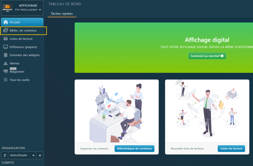 Pour insérer un nouveau contenu, il vous suffit de vous rendre dans la section Bibliothèque de contenus sur le menu de gauche.
