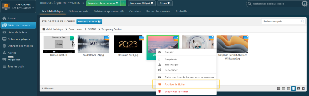 Pour archiver un contenu, ouvrez votre Bibliothèque de contenus et accédez au dossier où se trouve le fichier. Faites un clic droit sur le contenu et cliquez sur Archiver le fichier