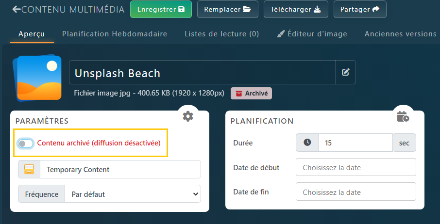 Archiver un contenu empêchera son affichage à l’écran. Contrairement à la suppression de l’élément, l’archivage ne sera pas supprimé de la plateforme, offrant ainsi un moyen simple de réutiliser un contenu ultérieurement.