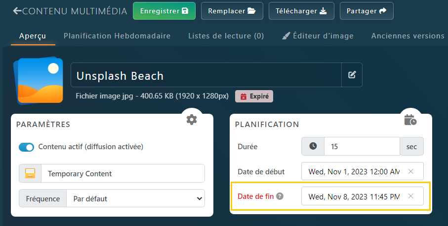 Double-cliquez sur n’importe quel fichier de la bibliothèque de contenu . Vous pouvez ensuite spécifier une date de fin après laquelle le fichier ne sera plus affiché à l’écran.