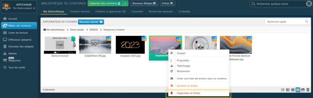 Pour supprimer un contenu, ouvrez votre Bibliothèque de contenus et accédez au dossier où se trouve le fichier. Faites un clic droit sur le contenu et cliquez sur Supprimer le fichier