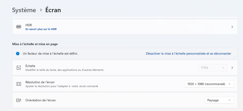 - Pour un écran 1080p, assurez-vous que la résolution de l’écran est bien configurée sur 1920×1080 et que l’échelle du texte est défini sur 100%