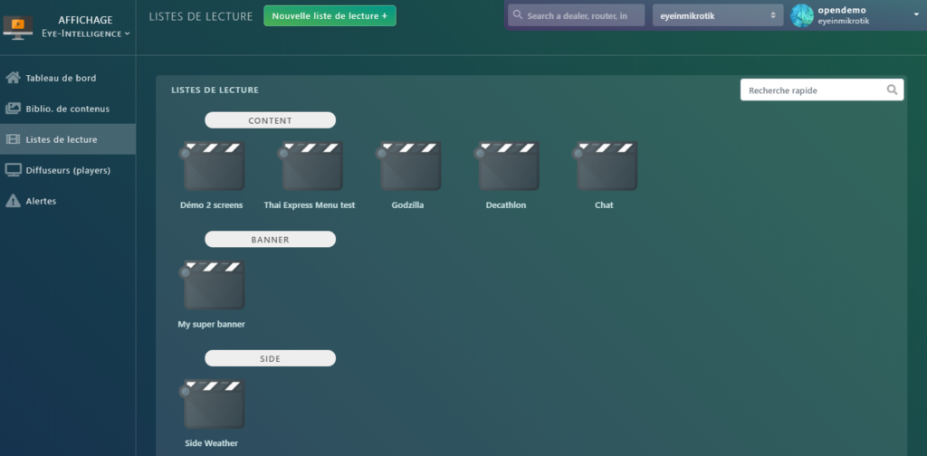 Les listes de lectures ont un principe similaire à une liste de musique, il s’agit d’une liste de fichiers et de dossiers à jouer les uns après les autres (ou bien avec un ordre aléatoire au choix). Les listes de lectures permettent de spécifier où doivent s’afficher les différents fichiers (sur quels écrans).