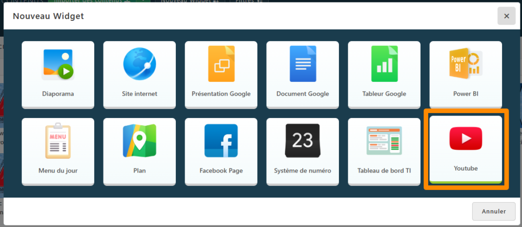 Pour insérer un vidéo YouTube, allez dans la bibliothèque de contenu, et cliquez sur Nouveau Widget.