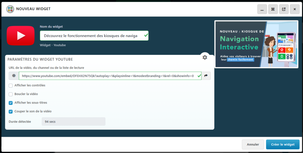Collez ce lien dans la case URL de la vidéo et cliquez ailleurs pour charger la vidéo (le nom et la durée seront détectés automatiquement). Vous pouvez activer les sous-titre et / ou couper le son de la vidéo (voir la section ci-dessous pour activer le son). Puis cliquez sur Créer le widget.