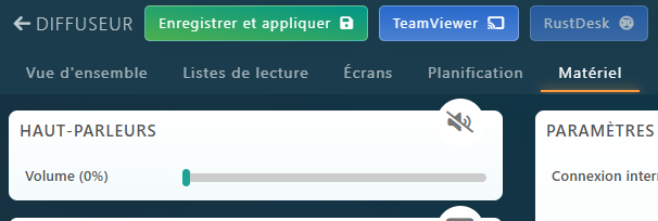 Par défaut, le son des diffuseur est coupé pour éviter des désagréments aux visiteurs et employés. Si vous souhaitez activer le son, ouvrez le diffuseur (player) et augmentez le volume dans l’onglet Matériel.