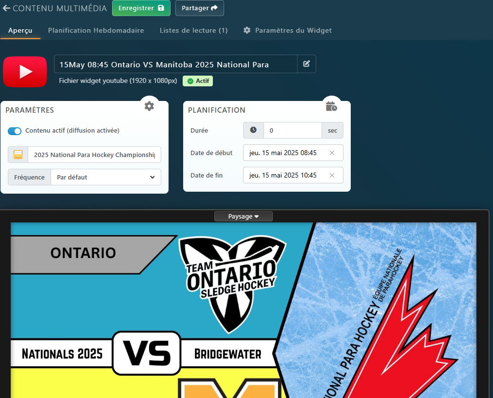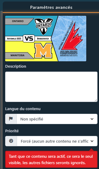 Si vous souhaitez que seule cette vidéo s’affiche (par exemple pour diffuser une game de hockey en direct au complet sans que les autres contenus s’affichent), vous pouvez mettre la priorité Forcé.