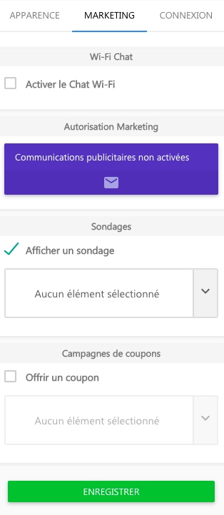 Attention. Pour qu’un sondage soit publié, il doit être assigné à une page de connexion pour qu’il soit visible aux clients. Pour ce faire, quand vous créé une page de connexion vous devez sélectionner ‘Afficher un sondage’ dans la section ‘Marketing’ du menu de droite. Une fenêtre s’ouvrira avec le fichier à sélectionner.