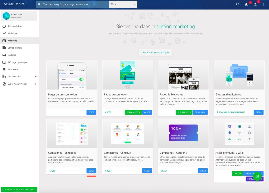 Pour publier un sondage, allez dans l’onglet ‘Marketing’ et sélectionnez ‘Gérer’ sous la section ‘Campagnes – Sondages’.
