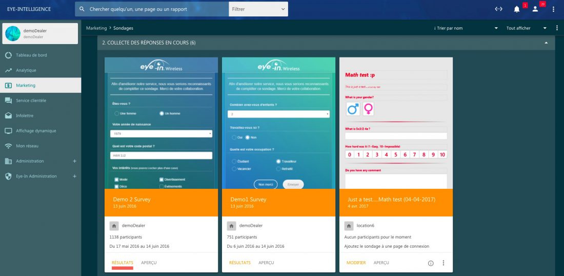 Pour voir les résultats d’un sondage, allez dans l’onglet ‘Marketing’ et sélectionnez ‘Gérer’ sous la section ‘Campagnes – Sondages’.