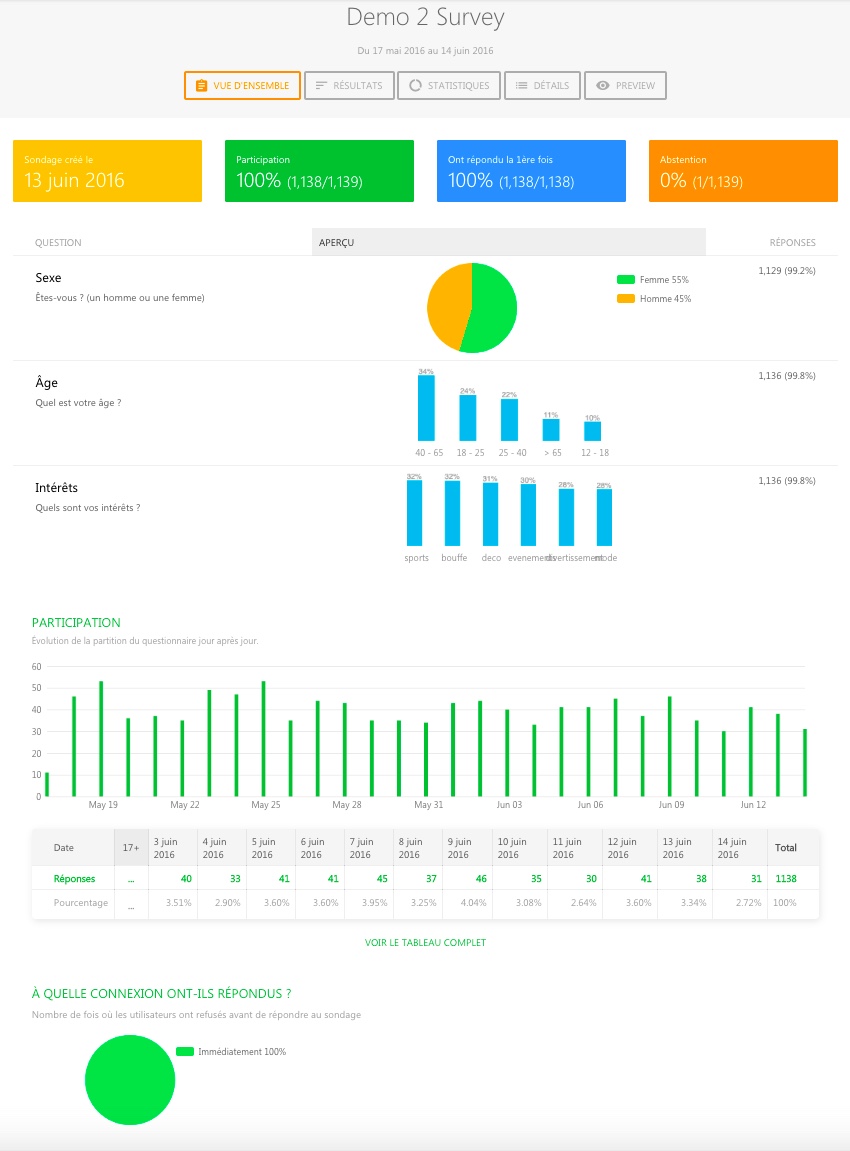 Une fois sur la page des résultats, vous trouverez différents onglets avec les données collectées lors du sondage. Ces onglets comprennent une vue d’ensemble des données, les résultats, les statistiques, les résultats en détails ainsi qu’un aperçu du sondage sur l’interface mobile. La page de vue d’ensemble permet de voir les questions posées ainsi que les résultats sous formes de graphiques. On y trouve aussi le taux de participation par dates, en pourcentage ou quantité.