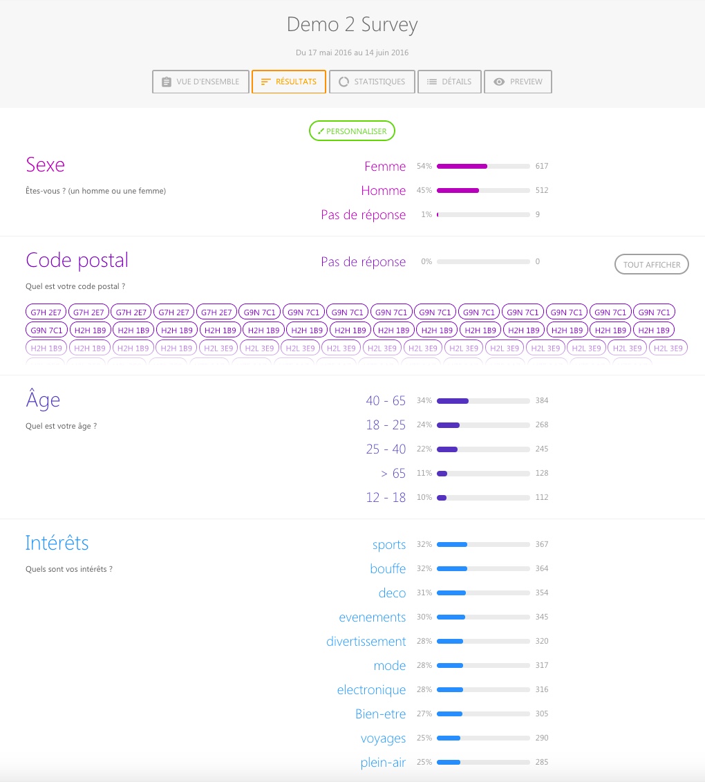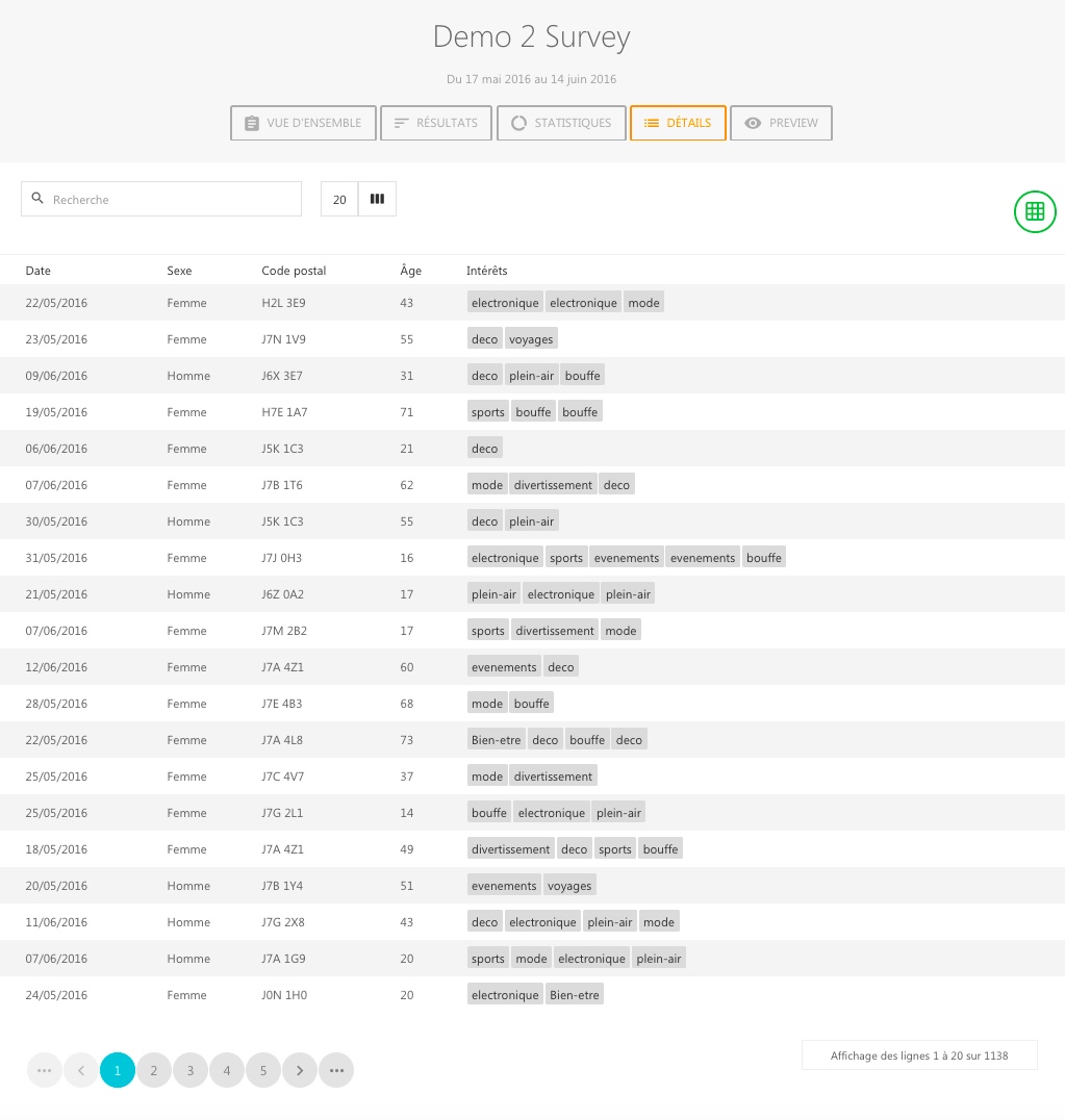 L’onglet ‘Détails’ permet de voir précisément les réponses des utilisateurs. De cette façon, nous savons que le 23 mai 2016, une femme de 55 ans vivant au J7N 1V9 a choisi comme intérêt la déco et les voyages.