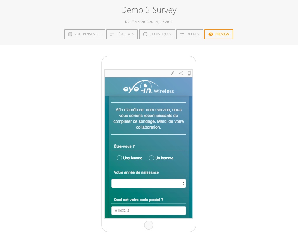 La section ‘Preview’ affiche le sondage dans une interface mobile, pour avoir une idée de ce que les clients ont vu, si la mise en page était lisible, etc.