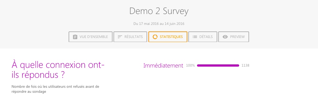 L’onglet ‘Statistiques’ permet de savoir le nombre et pourcentage d’utilisateurs qui ont répondu au sondage à la première, deuxième ou troisième connexion.