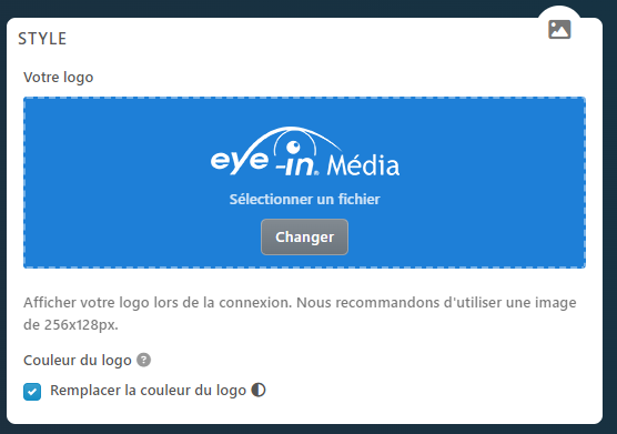 Pour compléter votre image de marque, vous pouvez également ajouter le logo de votre entreprise. Cliquez simplement sur le fichier pour sélectionner et télécharger l’image. Nous vous recommandons d’utiliser un PNG transparent de 256x128px.