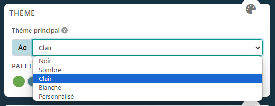 Utilisez la Palette de couleurs pour personnaliser d’avantage l’apparence et le style de la page. Basé sur le style principal, cela appliquera les couleurs aux boutons, aux cartes et aux arrières-plans.