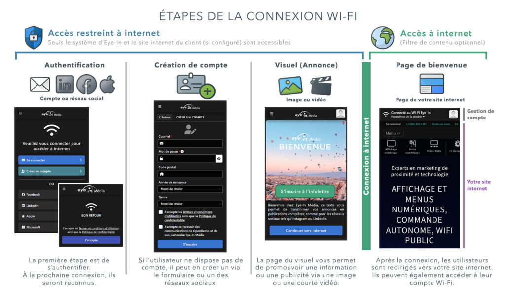Voici un aperçu des différentes étapes permettant à un utilisateur de se connecter à votre réseau Wi-Fi public. Ces étapes sont personnalisables.
