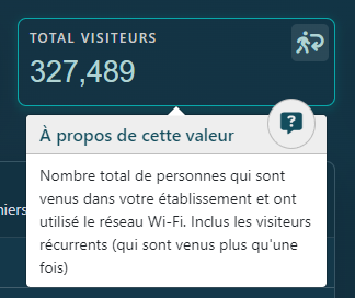- Le nombre total de visiteurs est le nombre total de personnes qui sont venues dans votre établissement et ont utilisé le réseau Wi-Fi. Inclut les visiteurs récurrents (qui sont revenus).