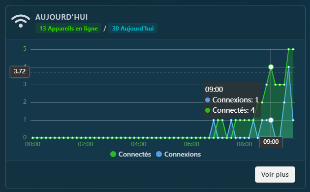 Ce graphique représente l’activité depuis le début de la journée. Il est particulièrement utile de surveiller l’utilisation et de s’assurer qu’il n’y a aucun problème de configuration ou d’alimentation.