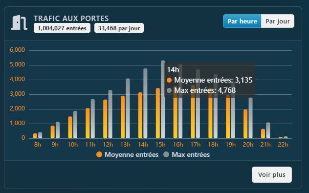 Le tableau de trafic des compteurs aux portes indique le nombre d’entrées et est enregistré auprès des compteurs de portes. Il est disponible pour présenter les données heure par heure ou jour par jour.