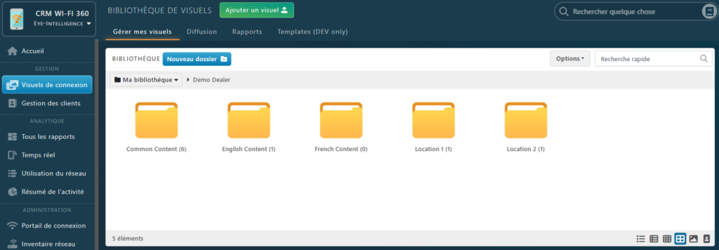La bibliothèque des visuels de connexion contient tout ce que vous souhaitez afficher sur votre page de connexion. Il peut s’agir d’images, de vidéos et bientôt de widgets. Pour être le plus intuitif possible, les visuels sont organisés en Dossiers.