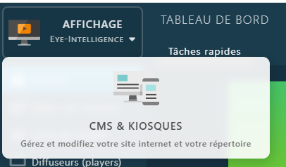 Pour y accéder une fois dans Eye-Intelligence, cliquez sur l’espace de travail en haut à gauche de l’application et sélectionnez CMS & KIOSQUES si vous n’y êtes pas déjà.