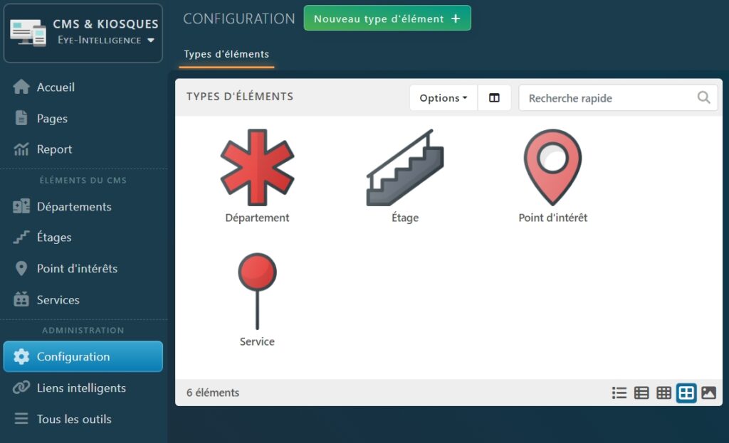 En plus des départements, la section ÉLÉMENTS DU CMS peut inclure d’autres catégories telles que les Services, les Étages et les Points d’intérêt. Pour ajouter des éléments il vout suffit de vous rendre dans la section Configuration sous ADMINISTRATION ou vous pourez ajouter un nouveau type d’élément en cliquant sur le boutton Nouveau type d’élément + en haut de l’écran.