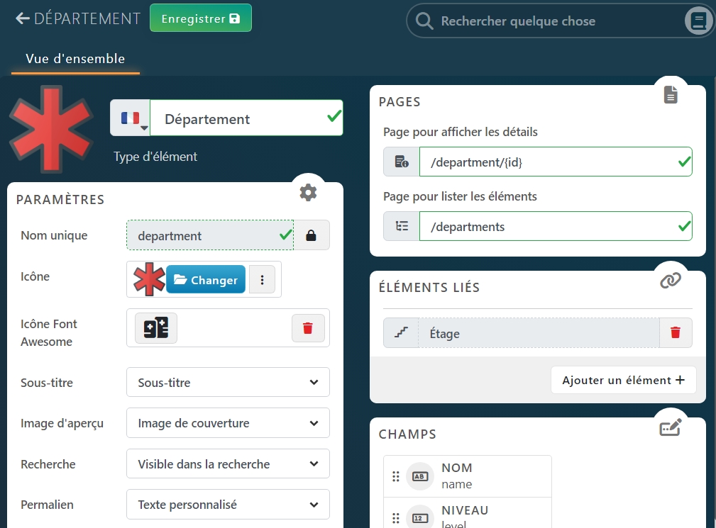 Lors de l’ajout ou la modification d’un élément, vous pouvez définir le nom, l’icône, l’URL de la page du répertoire, ou même les champs à remplire. Ainsi vous pouvez personnaliser a votre guise les éléments de votre répertoire.