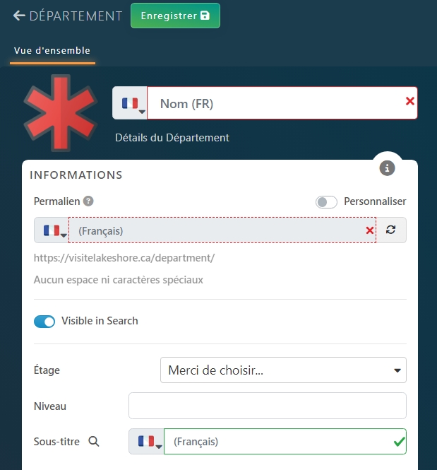 Pour ajouter un nouveau département, cliquez sur le bouton Nouveau Département + en haut de l’écran. Cela ouvrira une fenêtre de propriétés où vous pourrez saisir toutes les informations relatives au département, telles que son nom, étage, niveau, icone, image de couverture, etc. Vous avez également la possibilité de spécifier des informations particulières ou de cacher le département de la recherche si nécessaire.