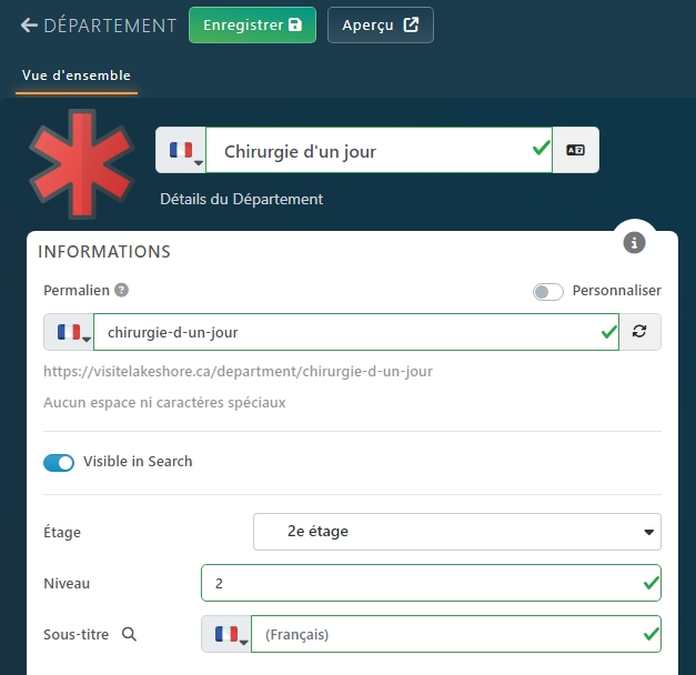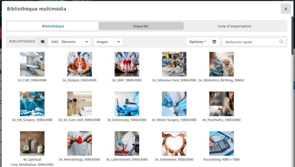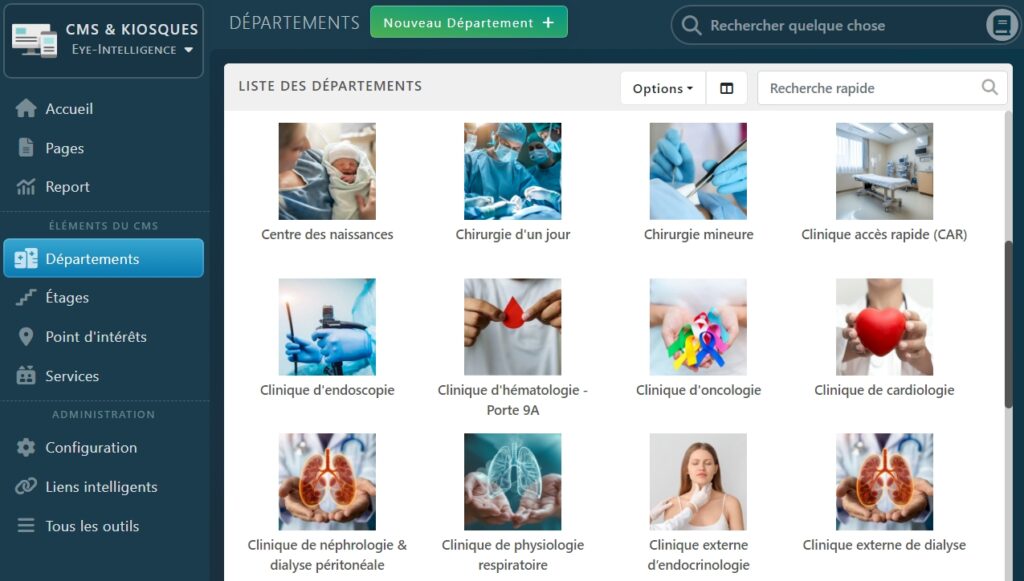 La section Départements sous ÉLÉMENTS DU CMS affiche une liste complète des départements de l’établissement. Cette liste est entièrement personnalisable, vous permettant d’ajouter ou de modifier les départements en fonction de l’évolution de vos services et de vos besoins.