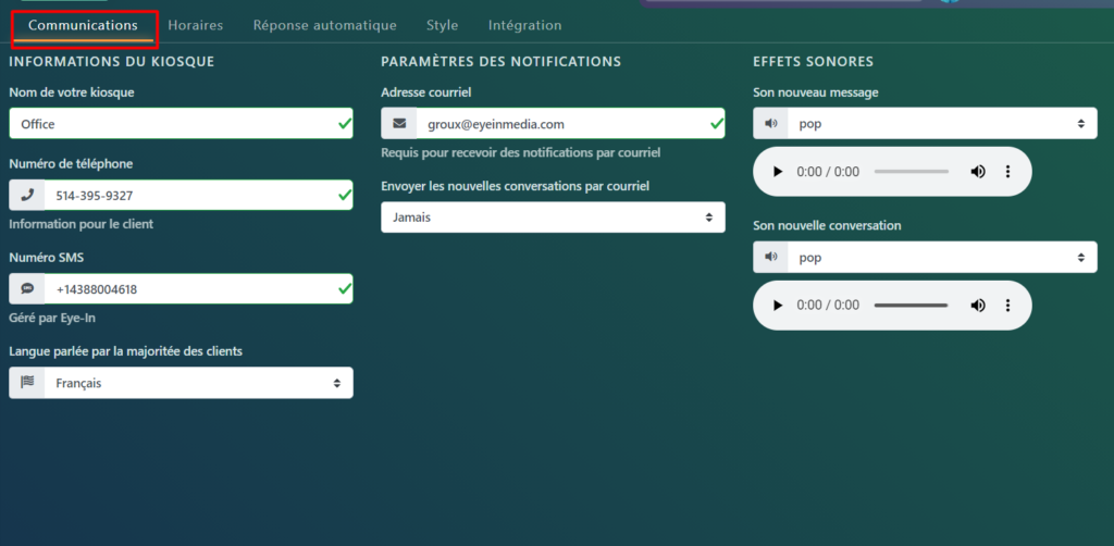 Si vous avez sélectionné l’onglet Communications, vous pouvez modifier les paramètres du kiosque, de la notification et des effets sonores.