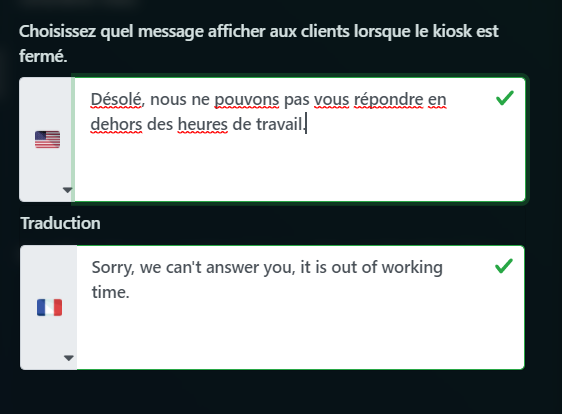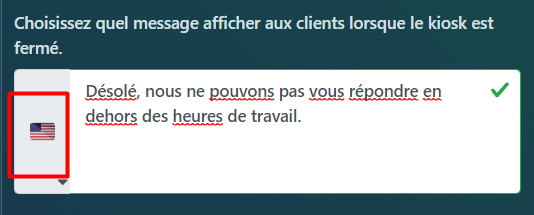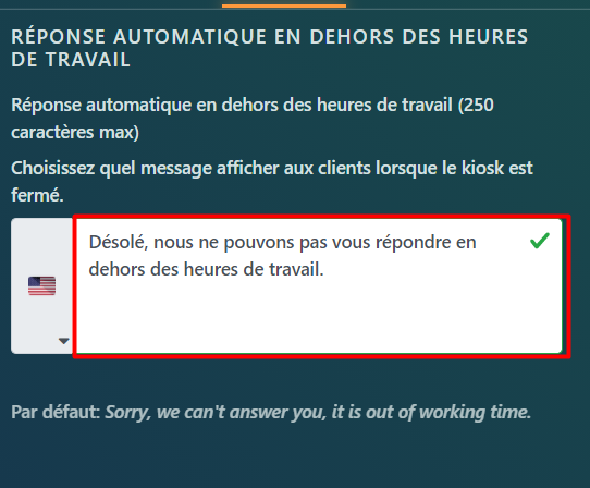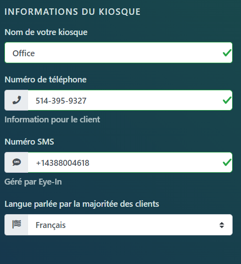 Pour les paramètres du kiosque, vous pouvez modifier le nom de votre kiosque, le numéro de téléphone, le numéro de SMS et la langue la plus fréquente du client: